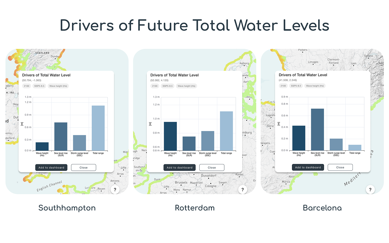 “A coastal engineer working on adaptation planning for the Dutch coastline used the Drivers of TWL data to determine that in their region, future total water levels were increasingly dominated by tidal range and sea-level rise, while wave height and storm surge level remained constant. This informed a dual approach of reinforcing flood barriers and elevating critical infrastructure, with less emphasis on wave attenuation measures.”